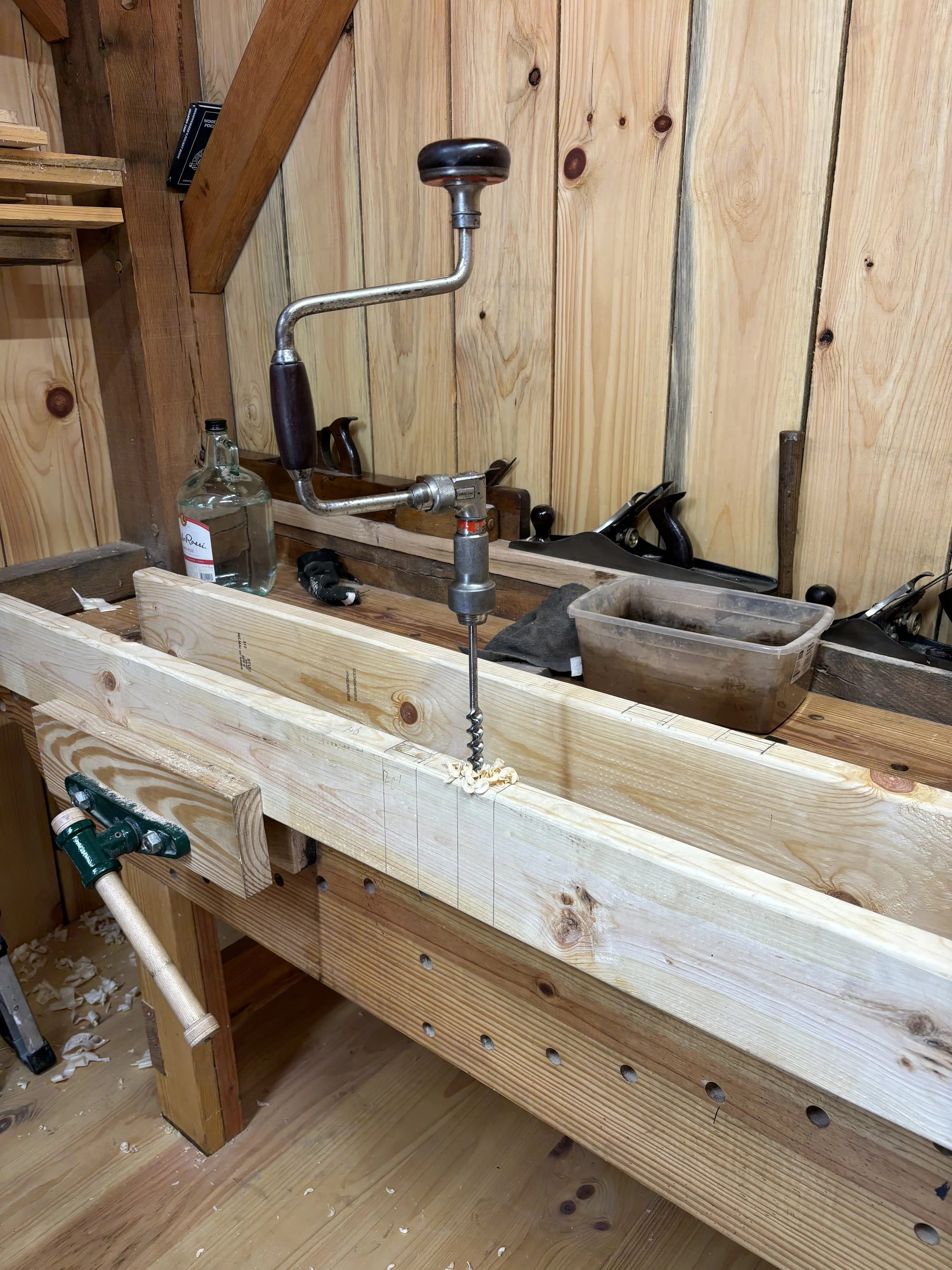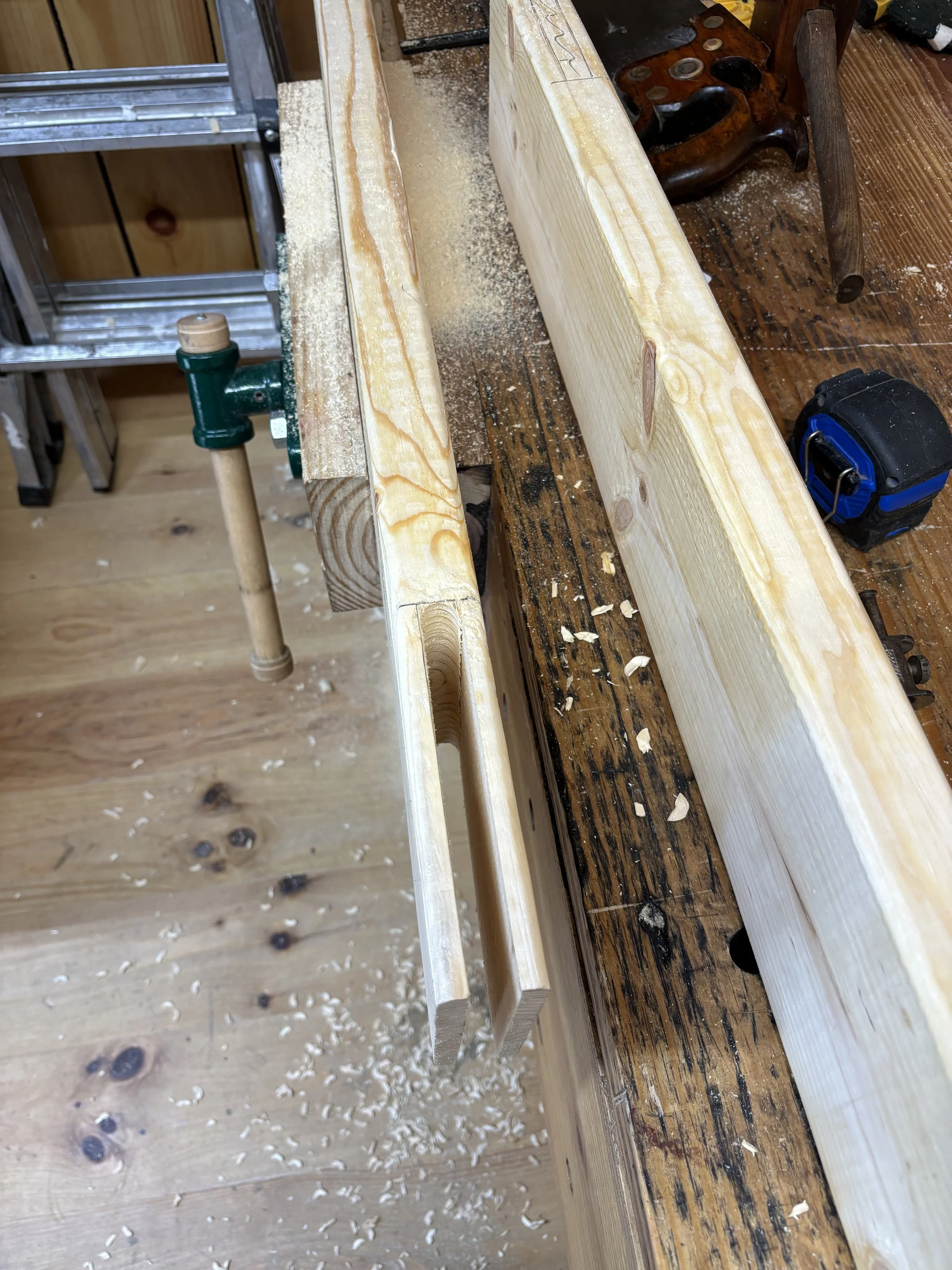 I drilled two 3/4 holes into the rails, pulled 1 1/2 back from the inside edges of the joint, and draw-bored the tenons on the stiles diagonally both towards the rail and towards the center of the door. I rived four pegs from a scrap piece of oak, tapered them with a chisel, left them proud during assembly, and cut them flush when the glue had dried.