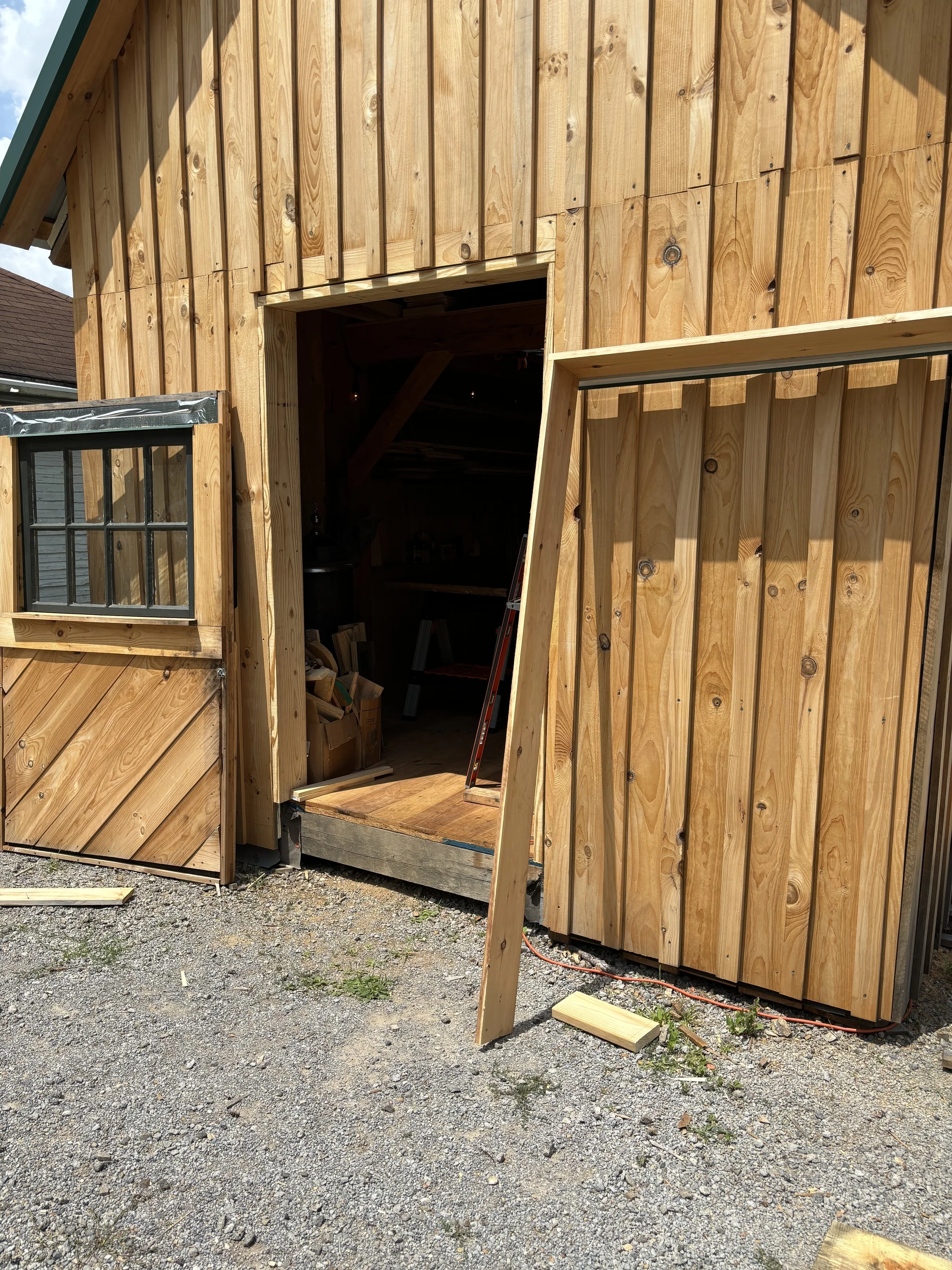 Installing the door is not a one man operation, though it can be managed. I shimmed the bottom of the door so it swung slightly above the ground and installed two strap hinges on the inside. My strap hinges had a little bit of vertical play in them: you could wiggle the far edge of the strap up and down maybe 1/8” both ways, for a total travel of about 1/4”. That could be a big problem for a newly installed door. To counteract this, I ensured that the straps were flexed to the full extent of their downward travel when they were installed, so the door could not sag on its hinges any more.